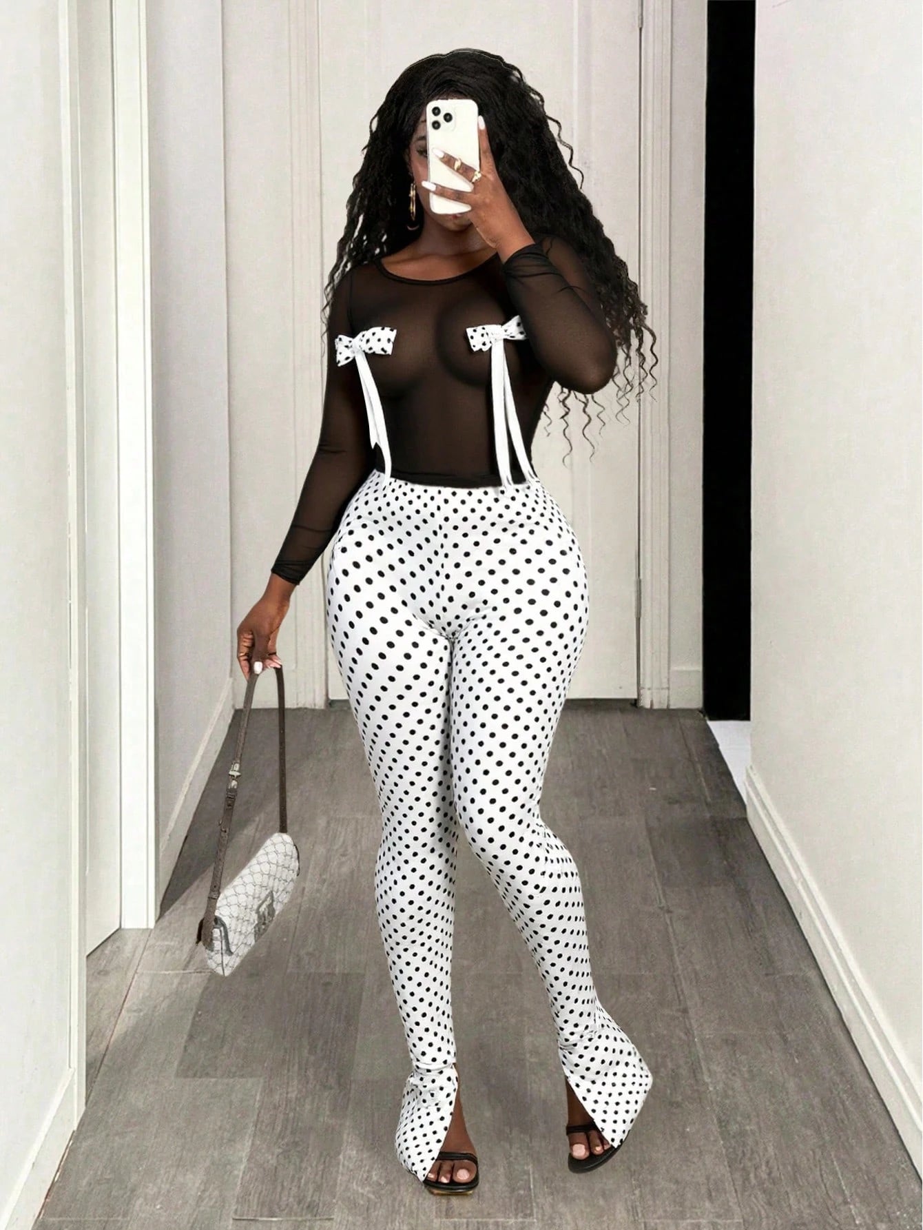 This elegant two piece set features a black and white color scheme, with a mesh bow tie top and polka dot slit pants. Perfect for special occasions, the mesh fabric adds a touch of sophistication while the bow tie detail adds a feminine touch. Elevate your wardrobe with this timeless ensemble.