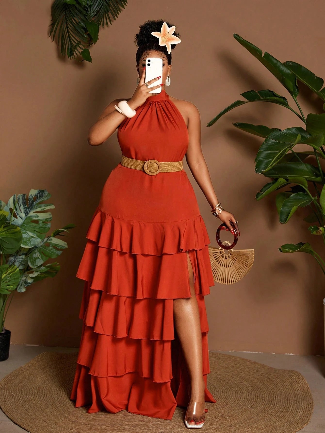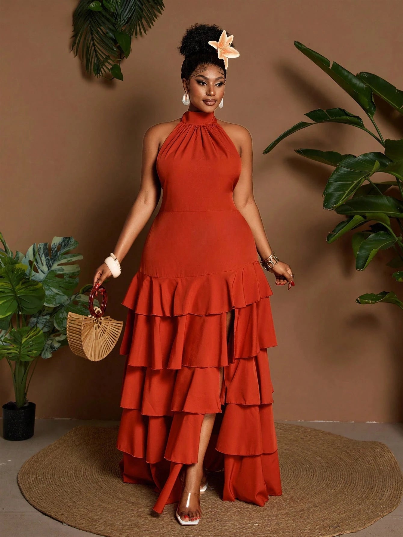 This plus-size maxi dress features a multi-layered ruffle design and an elegant halter neck, combining stylish details with a flattering silhouette. The flowing layers add movement and sophistication, perfect for formal occasions or evening events. Its thoughtful cut ensures comfort and confidence, celebrating curves with timeless grace.