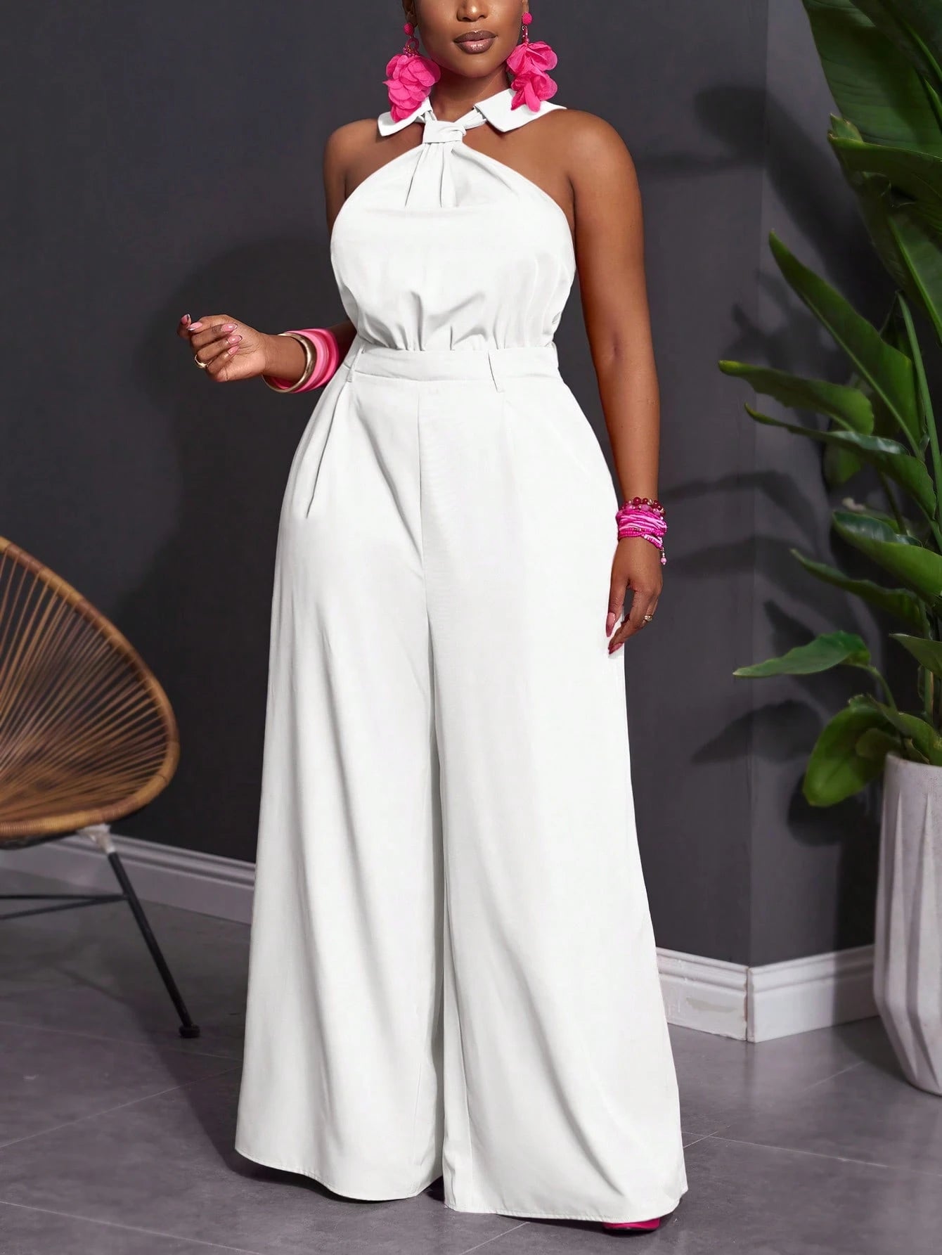 This plus-size sleeveless jumpsuit features distinctive lapels that add a tailored touch to its modern silhouette. Designed to flatter curves while offering comfort and ease of movement, it combines sophistication with a streamlined, sleeveless cut. Ideal for professional or evening wear, this jumpsuit provides a versatile foundation for polished styling.